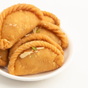 Appearance: Gujiya stands out with its distinctive crescent shape, sealed at the edges to encase the delicious filling.